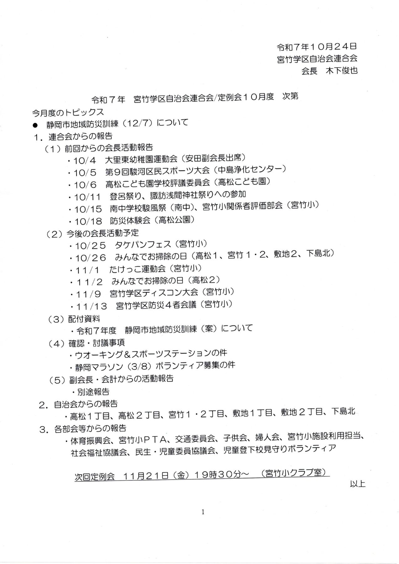 〇 駿河区自治会連合会理事会次第